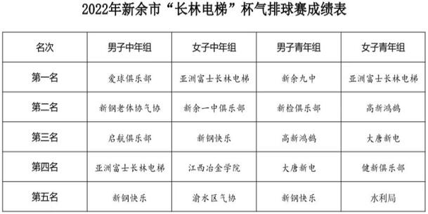 經過近三天激烈的對決,最終,亞洲富士長林(lin)電梯(ti)代(dai)(dai)表(biao)隊獲女(nv)子(zi)中年(nian)組和女(nv)子(zi)青年(nian)第(di)一名,愛球俱樂部代(dai)(dai)表(biao)隊獲男子(zi)中年(nian)組第(di)一名,新余九中代(dai)(dai)表(biao)隊獲男子(zi)青年(nian)組第(di)一名。